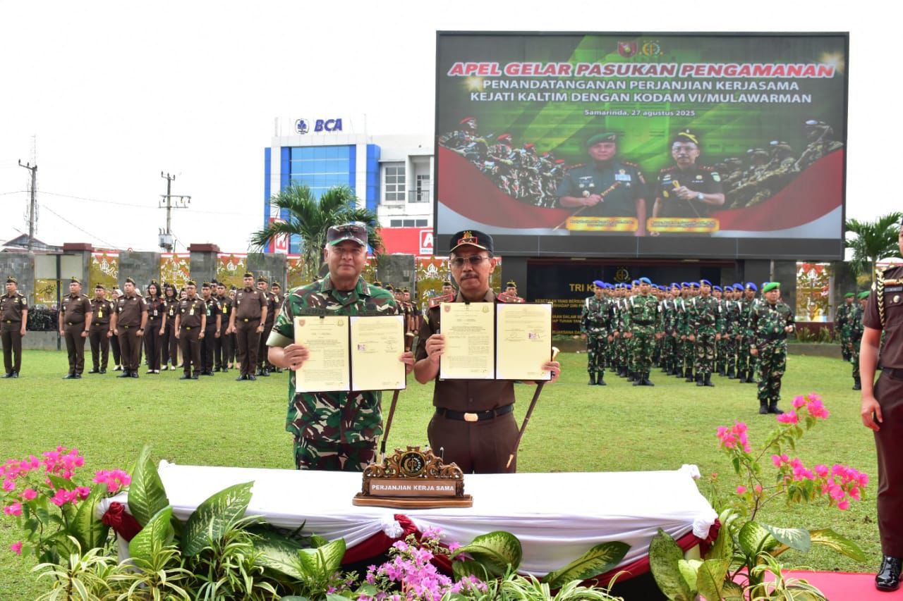 MARITIMPOST.Com, Samarinda – Kejaksaan Tinggi (Kejati) Kalimantan Timur bersama Kodam VI/Mulawarman menggelar apel gelar pasukan pengamanan sekaligus penandatanganan perjanjian kerja sama di halaman kantor Kejati Kaltim, Rabu (27/8/2025). Kegiatan ini bertujuan memperkuat sinergi antarlembaga dalam mendukung stabilitas dan penegakan hukum di wilayah Kalimantan Timur.