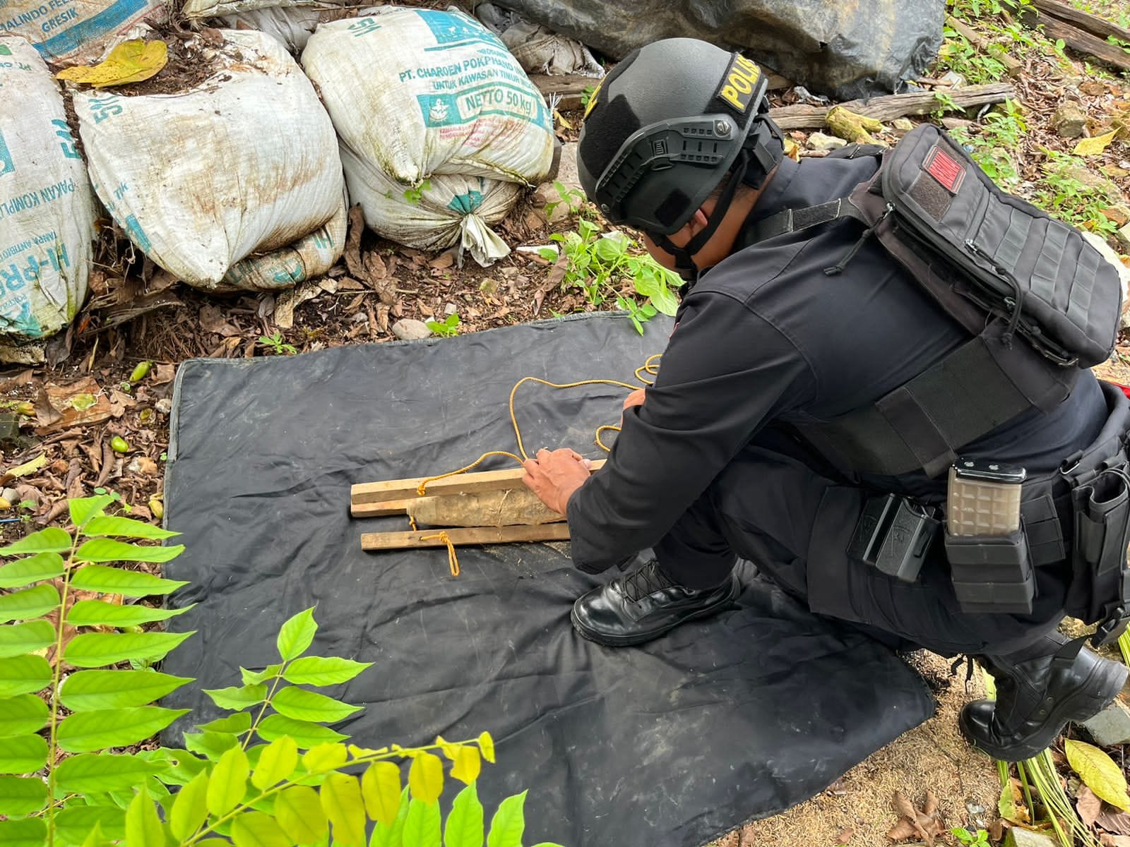 Sebelum tim jibom datang Bhabinkamtibmas sudah melakukan pemasangan police line, agar masyarakat tidak mendekat ke TKP di karenakan barang yang diduga sisa peninggalan Jepang ini tergolong bahan berbahaya.