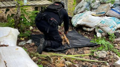 MARITIMPOST.COM, Balikpapan – Tim Jibom Den Gegana Satuan Brimob Polda Kaltim mengevakuasi bahan peledak jenis mortir yang ditemukan oleh warga bernama Winarko (44) di Jalan Gn Afco Perum PGRI Blok C nomor 13 Rt 29, Lamaru, Balikpapan Timur pada Sabtu (20/1/2024).
