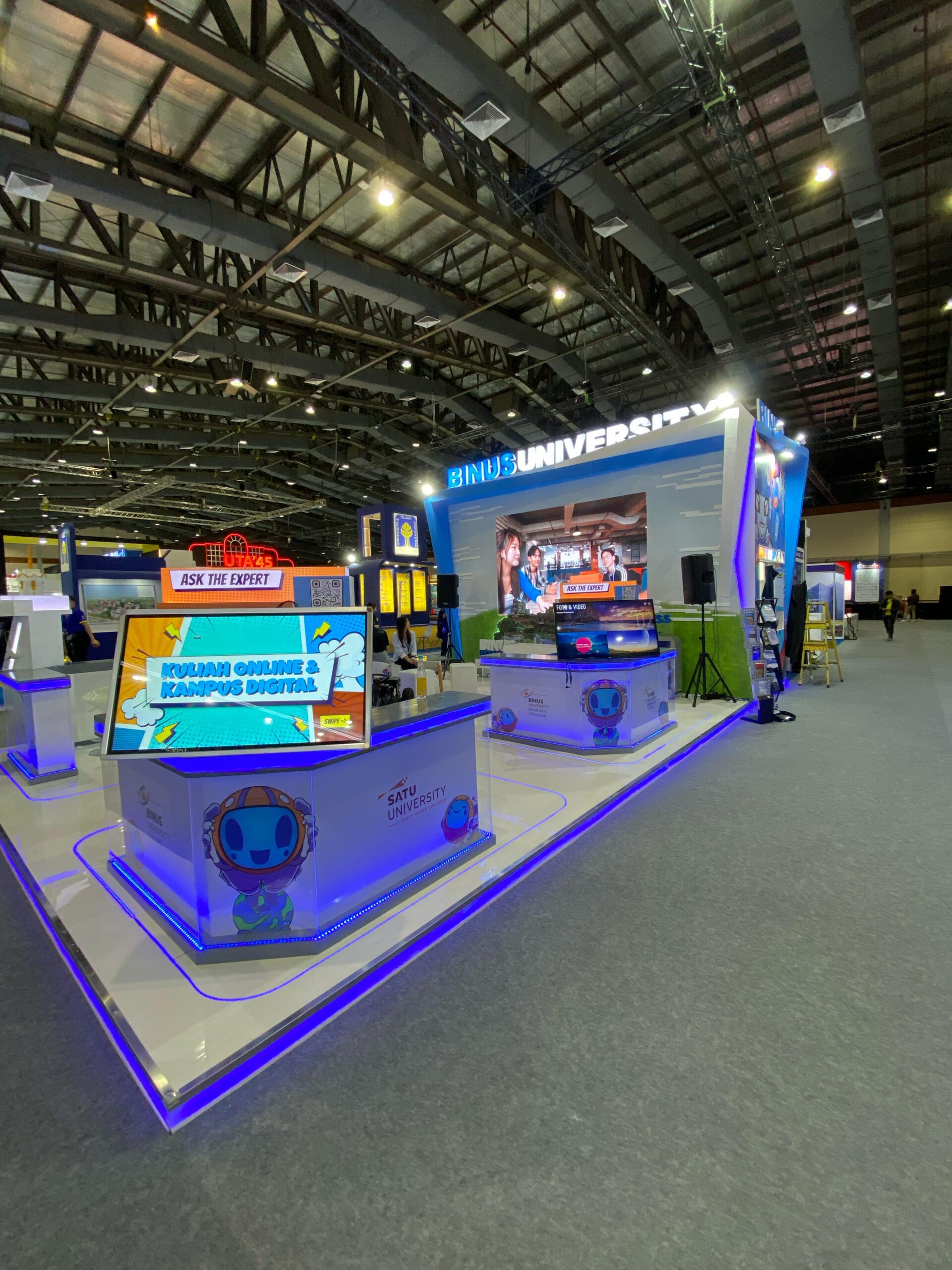 Booth Binus University menekankan konsep faculty experience yang menarik dan menyenangkan, pengunjung tidak hanya dapat bertanya tentang jurusan yang diminati, tetapi juga dapat langsung merasakan pengalaman praktis melalui kegiatan demonstrasi jurusan dan pameran karya Mahasiswa.