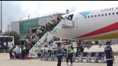 Sebanyak 324 jamaah haji yang tergabung dalam kloter pertama ini mendarat dengan selamat setelah menunaikan rangkaian ibadah haji di Tanah Suci.